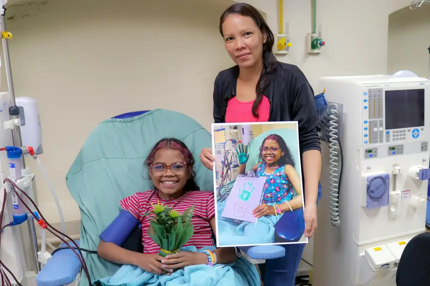 Renutimilly Braga de Oliveira, 9 anos, faz diálise na Santa Casa desde um ano de idade, e diz que vai ganhar um rim que é presente de sua mãe. “Estou muito feliz com esse presente. Vou comemorar com minha família”. A mãe Rosiane Ferreira Braga, que é de Altamira, relata que já está a 8 anos com a filha em Belém, e depois de toda uma preparação decidiu doar seu rim para ela. Rosiane destaca emocionada a importância do ato. “Faz muita diferença na vida dos nossos filhos. Ela é a mais nova dos três filhos que tenho. Mas só ela que nasceu com esse problema renal. E durante o tempo, coloquei no meu coração, desde a primeira consulta dela do pré-transplante, o desejo de ser a doadora para minha filha”.